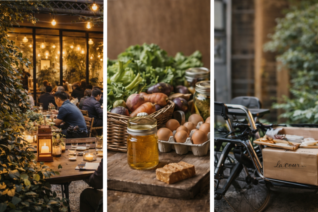 La Cour propose une cuisine bistronomique élaborée à partir de produits frais, de saison et majoritairement issus de circuits courts.